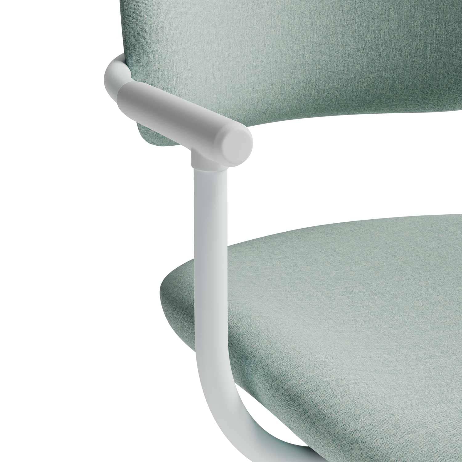 Jeho minimalistická biela konštrukcia je doplnená čalúnením dostupným v šedej, horčicovej alebo mätovej farbe, ktoré vytvára čistý, moderný estetický dojem, ktorý sa prispôsobí rôznym štýlom interiéru. Jeho zaoblený tvar je navrhnutý tak, aby prirodzene priliehal k operadlu a poskytoval ergonomickú oporu, ktorá uprednostňuje pohodlie aj pri dlhých hodinách používania.