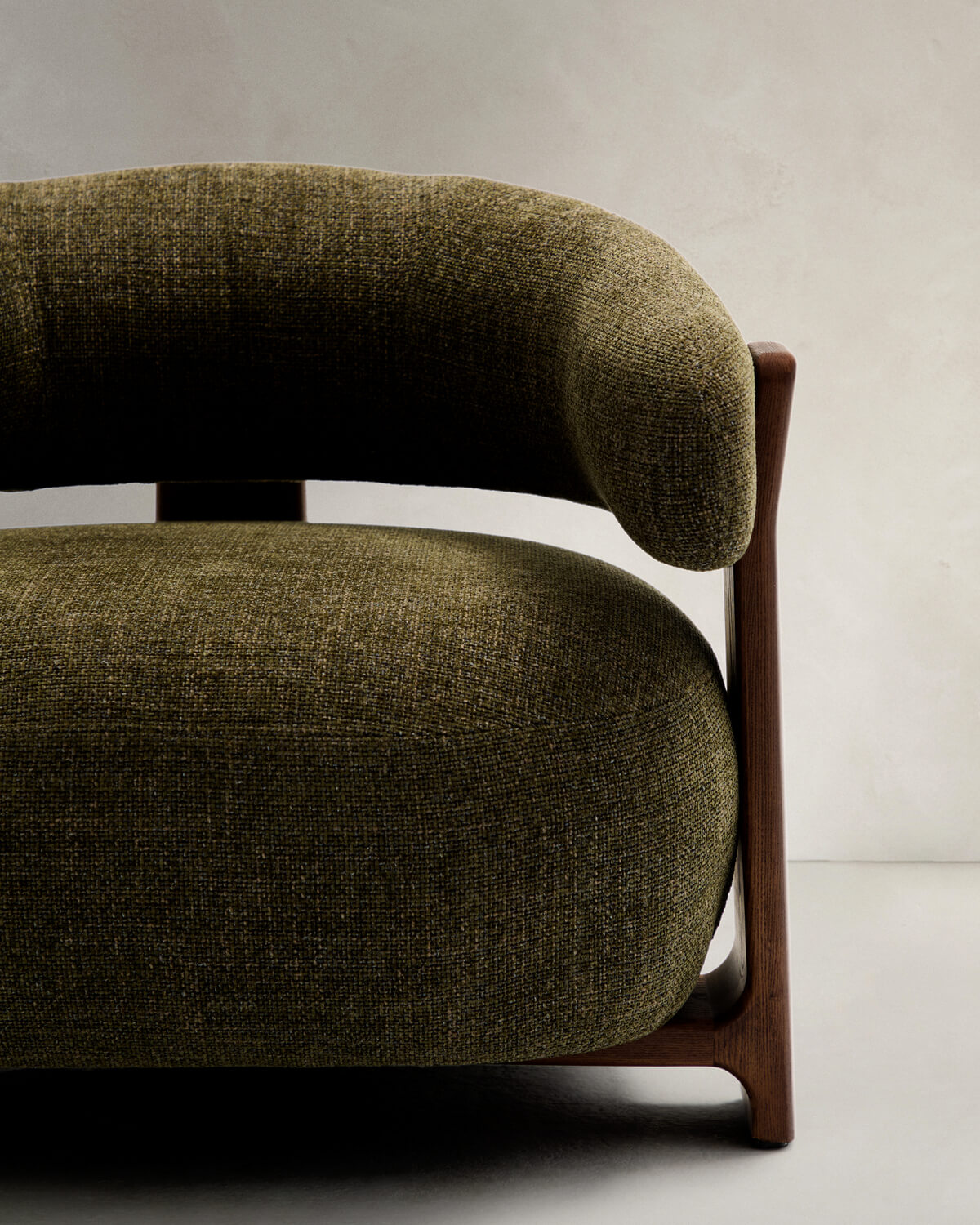 Čalúnenie je vyrobené z kvalitnej dvojfarebnej zelenej ženilky, ktorá kombinuje recyklovaný polyester a ekologicky šetrné materiály. Sedák má strednú tuhosť a tkanina je certifikovaná podľa štandardu GRS, čo zaručuje ekologicky bezpečnú výrobu a zníženie negatívneho vplyvu na životné prostredie. Nohy kresla sú vyrobené z masívneho jaseňového dreva v orechovom prevedení a majú certifikáciu FSC, čo potvrdzuje, že drevo pochádza zo zodpovedného lesného hospodárstva.