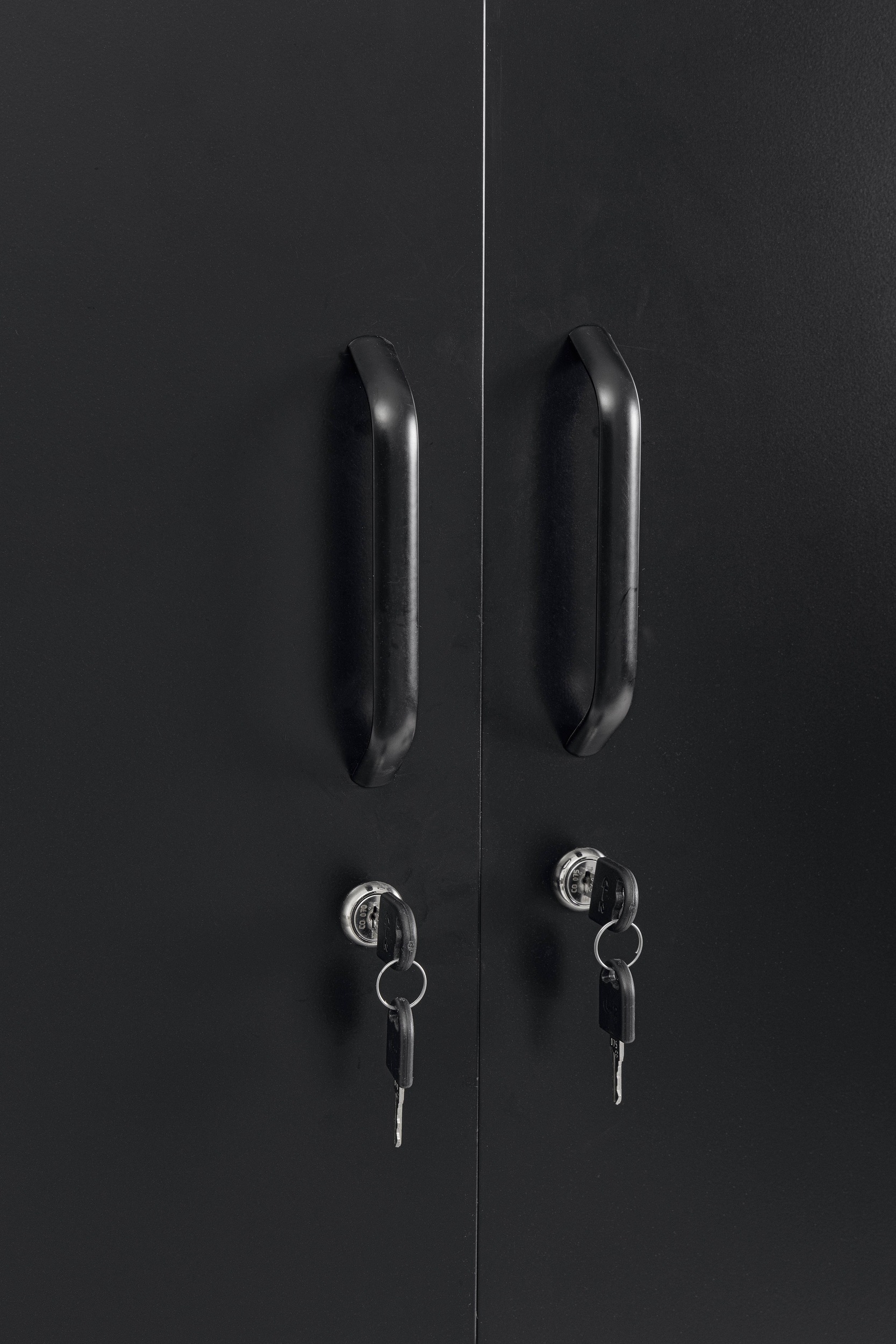 Táto robustná skriňa je vyrobená z ocele s práškovo vypaľovanou (epoxy) povrchovou úpravou, ktorá zaručuje dlhú životnosť a odolnosť proti korózii. Disponuje dvoma výškovo nastaviteľnými policami pre flexibilné usporiadanie úložného priestoru a dvoma odnímateľnými tyčami – ideálny na zavesenie oblečenia alebo doplnkov. Dizajn je jednoduchý, praktický a vhodný do rôznych interiérov – od garáže až po šatňu.