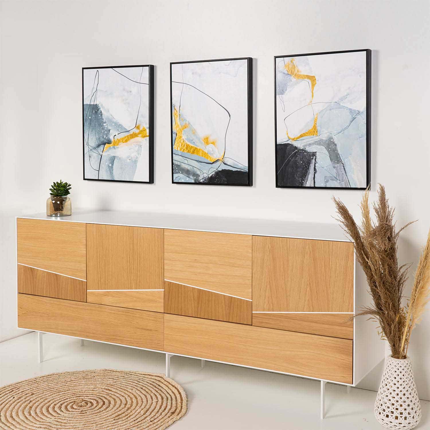 Set troch obrazov TAONGA vkusne ozdobí váš interiér a vnesie doň svieži nádych. Pozornosť zaujme zlatá farba, ktorá na obrazoch dominuje a dodáva mu eleganciu a nádych luxusu. Vyladený triptych tvorí dokonalú kombináciu, ktorá najlepšie zažiari v obývacej izbe či spálni. Vďaka kovovým háčikom ho ľahko a pohodlne zavesíte kamkoľvek na stenu.