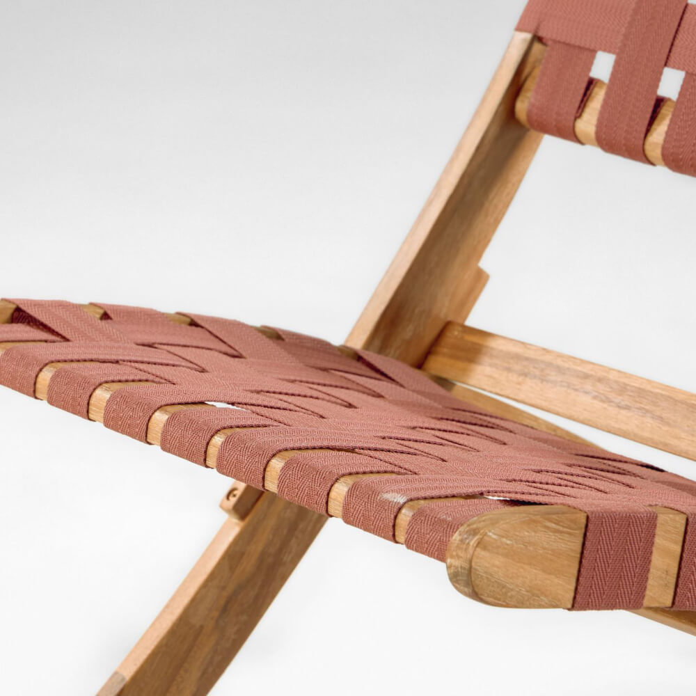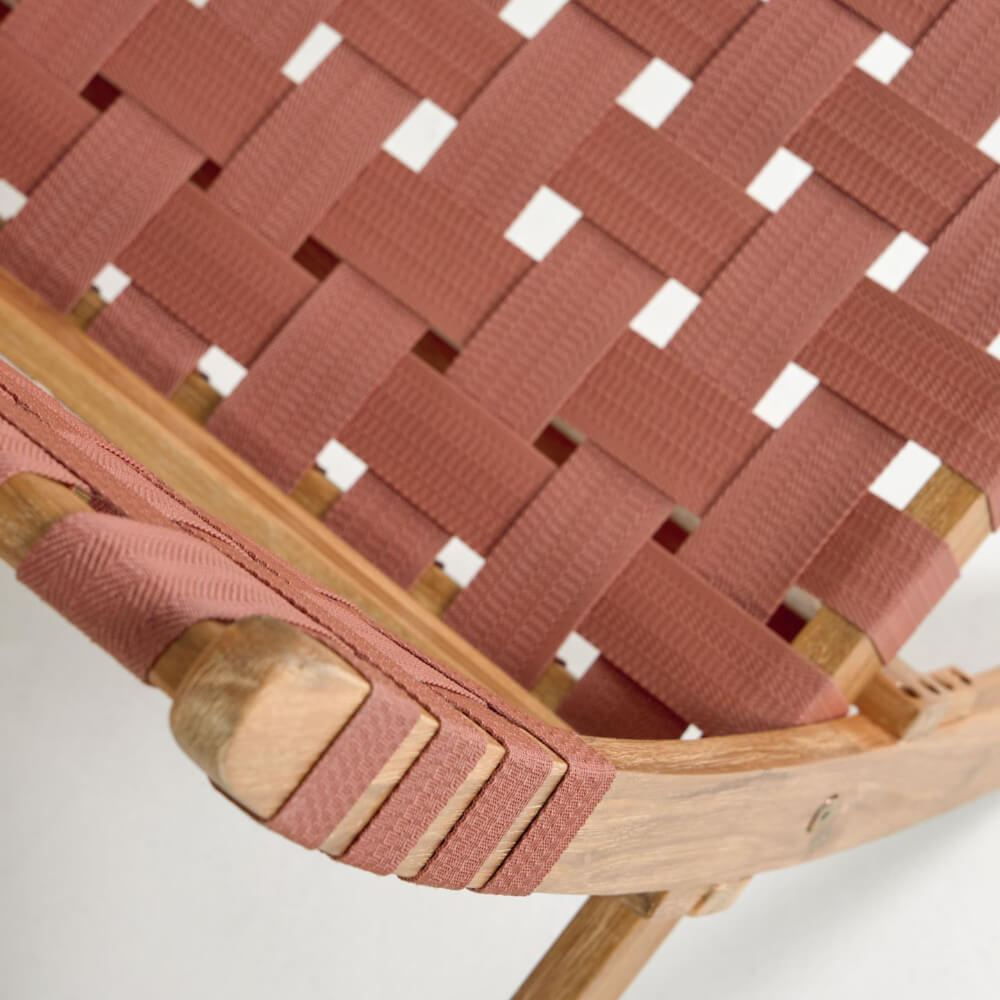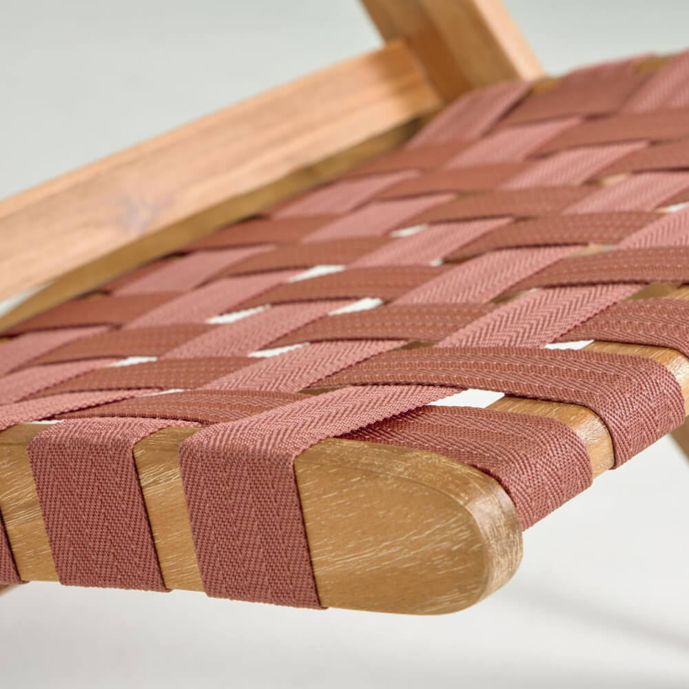 Stolička Chabeli pozýva na relaxáciu a určovanie trendov vo vašom vonkajšom priestore vďaka kombinácii ekologického dreva a ružovej farby ručne tkaného sedadla. Masívne akáciové drevo s jedinečnými tónmi a vzory, pochádza z udržateľne obhospodarovaných lesov s kontrolovaným výrubom.