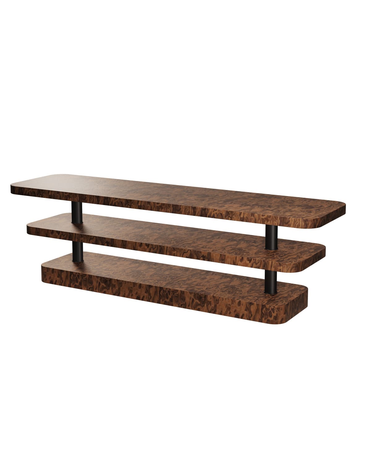 Dodajte svojmu domovu štýl s TV stolíkom Rel – elegantným spojením kvalitných materiálov a dizajnu, ktorý poteší na pohľad aj na dotyk. Tento kúsok zaujme kombináciou prvotriednych dyh a oceľových prvkov, ktoré spoločne vytvárajú moderný a nadčasový vzhľad. Povrchová úprava tela je prevedená exkluzívnou talianskou dyhou California Burl, ktorá vyniká svojou jemnou kresbou a luxusným dojmom.