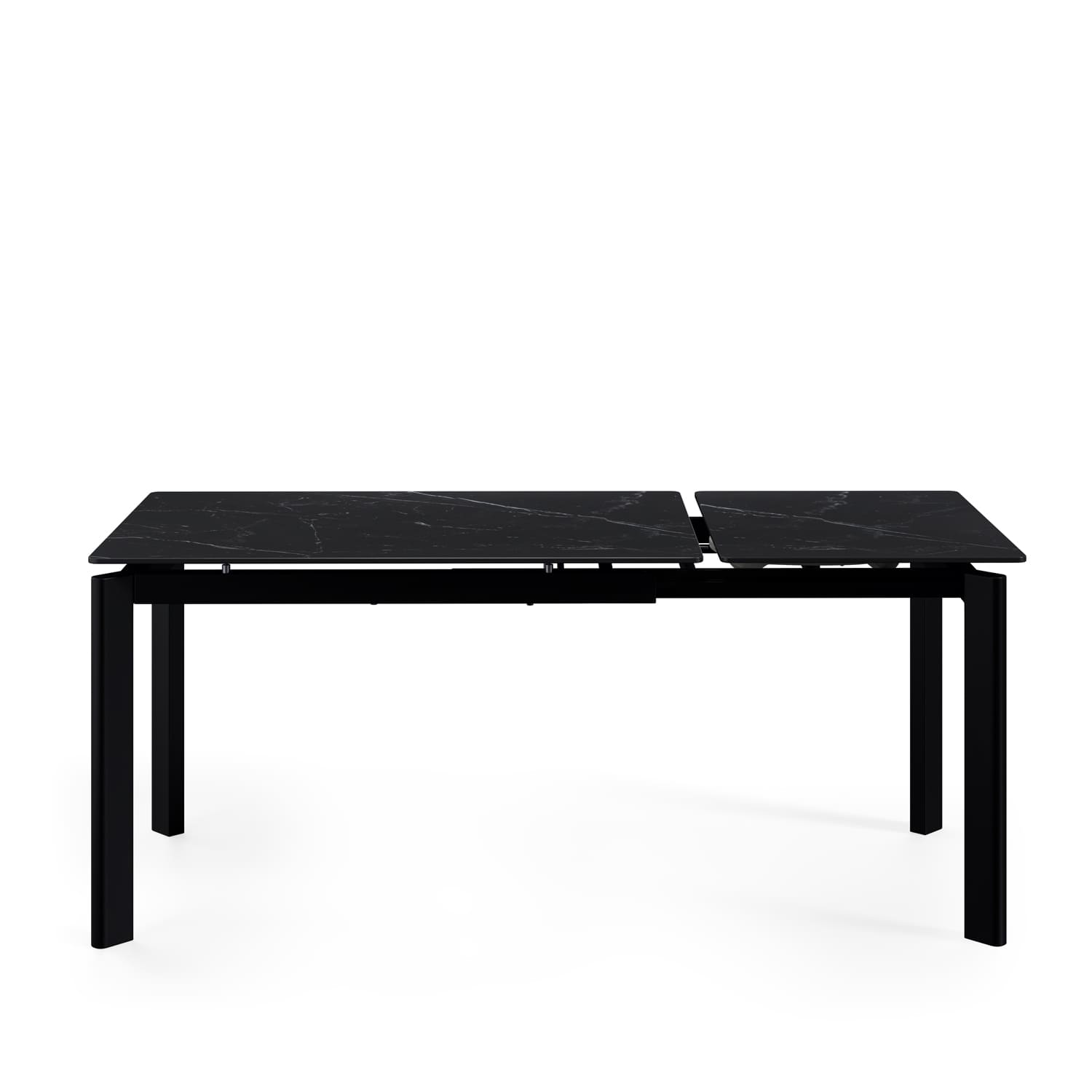 Matne čierna porcelánová doska s hrúbkou 1,1 cm sa plynule prelína so zodpovedajúcimi železnými nohami a vytvára tak výraznú vizuálnu kontinuitu, ktorá vyjadruje solídnosť a eleganciu. Táto monochromatická kombinácia posilňuje jej estetickú prítomnosť a robí z nej perfektný doplnok do industriálneho.