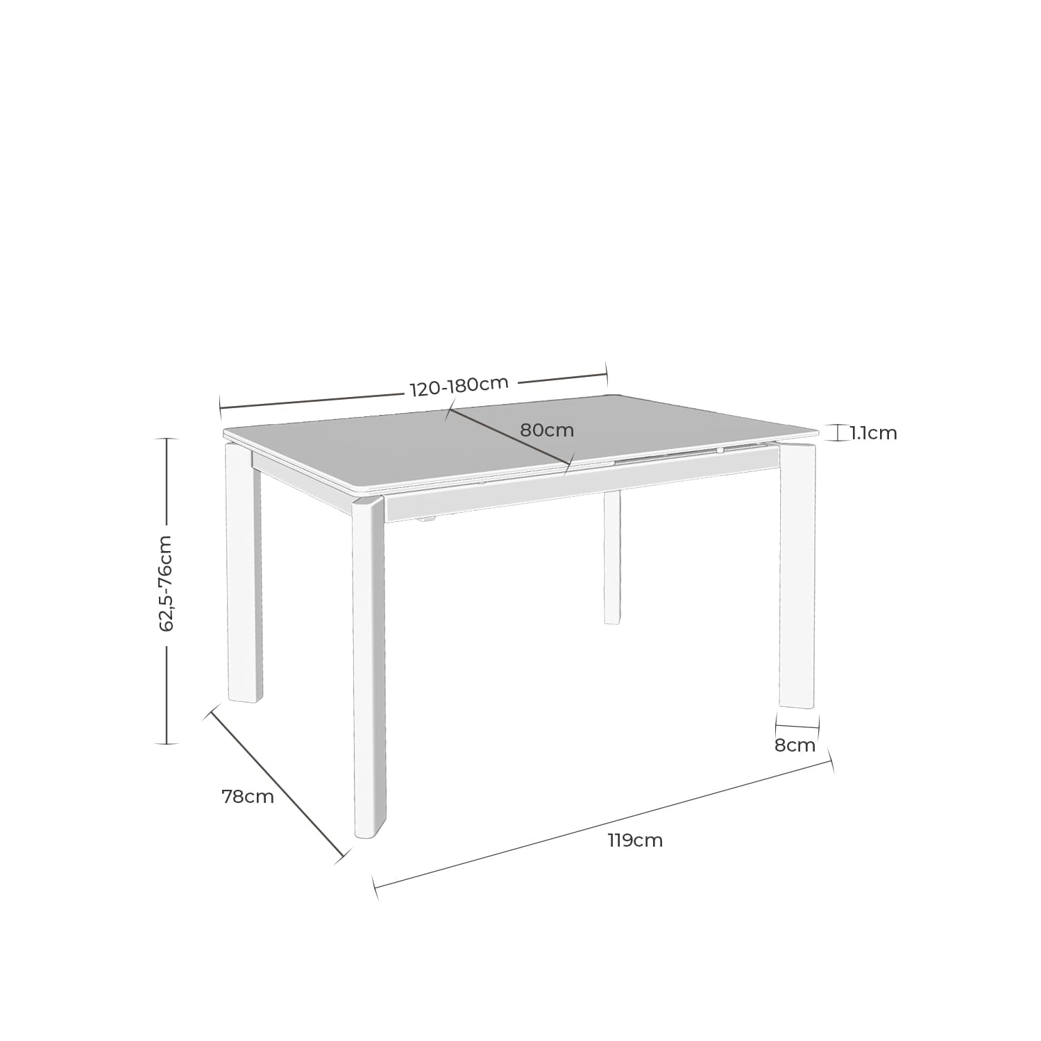 Robustný železný rám pevne drží dosku stola a vytvára vizuálny kontrast, ktorý zdôrazňuje jeho čisté línie a rafinovaný industriálny charakter. Jeho obdĺžnikový dizajn, kompaktný v zloženom stave (120 cm), je možné ľahko transformovať vďaka otočnému bočnému predĺženiu o 60 cm, ktoré dosahuje dĺžku 180 cm, a umožňuje tak väčšie stretnutie alebo rodinné večere.